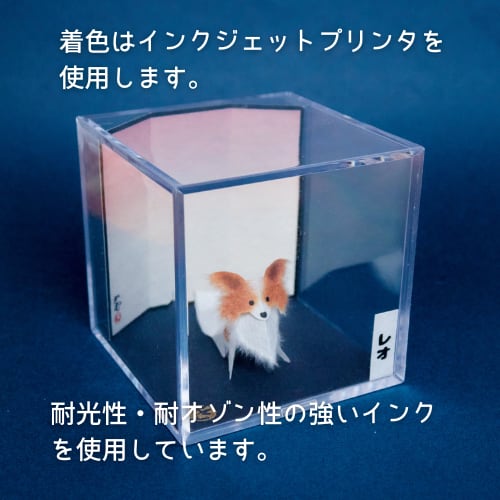 ・高品質な和紙に純正インクで着色し、65mm四方のUVカットケースに入れてお届けします。